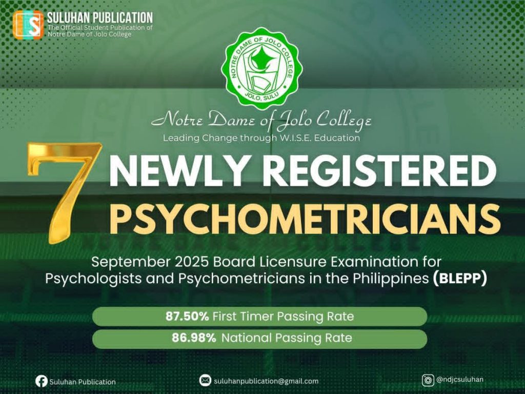 NDJC Generates 7 Newly Registered Psychometrician in September 2025 PLE Demonstrating its commitment to academic excellence, Notre Dame of Jolo College (NDJC) showcased a notable performance in the September 2025 Psychometrician Licensure Examination (PLE) after achieving an impressive 87.50% (7 out of 8) passing rate among first-time takers. In total, the college fielded 11 examinees […]